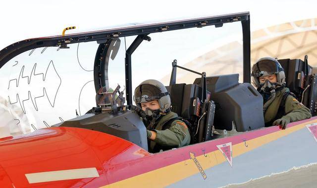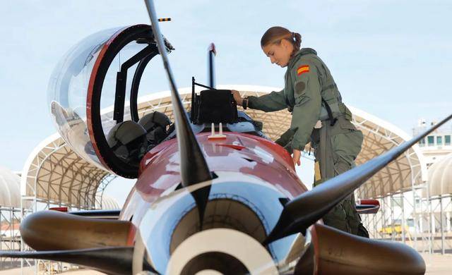 莱昂诺尔公主穿着军装,梳着麻花辫,英姿飒飒,气场强大,眼神坚定。她驾驶皮拉图斯PC-21型号教练机飞越穆尔西亚海域,那一刻画面定格,超级帅,真是女王风范初显。