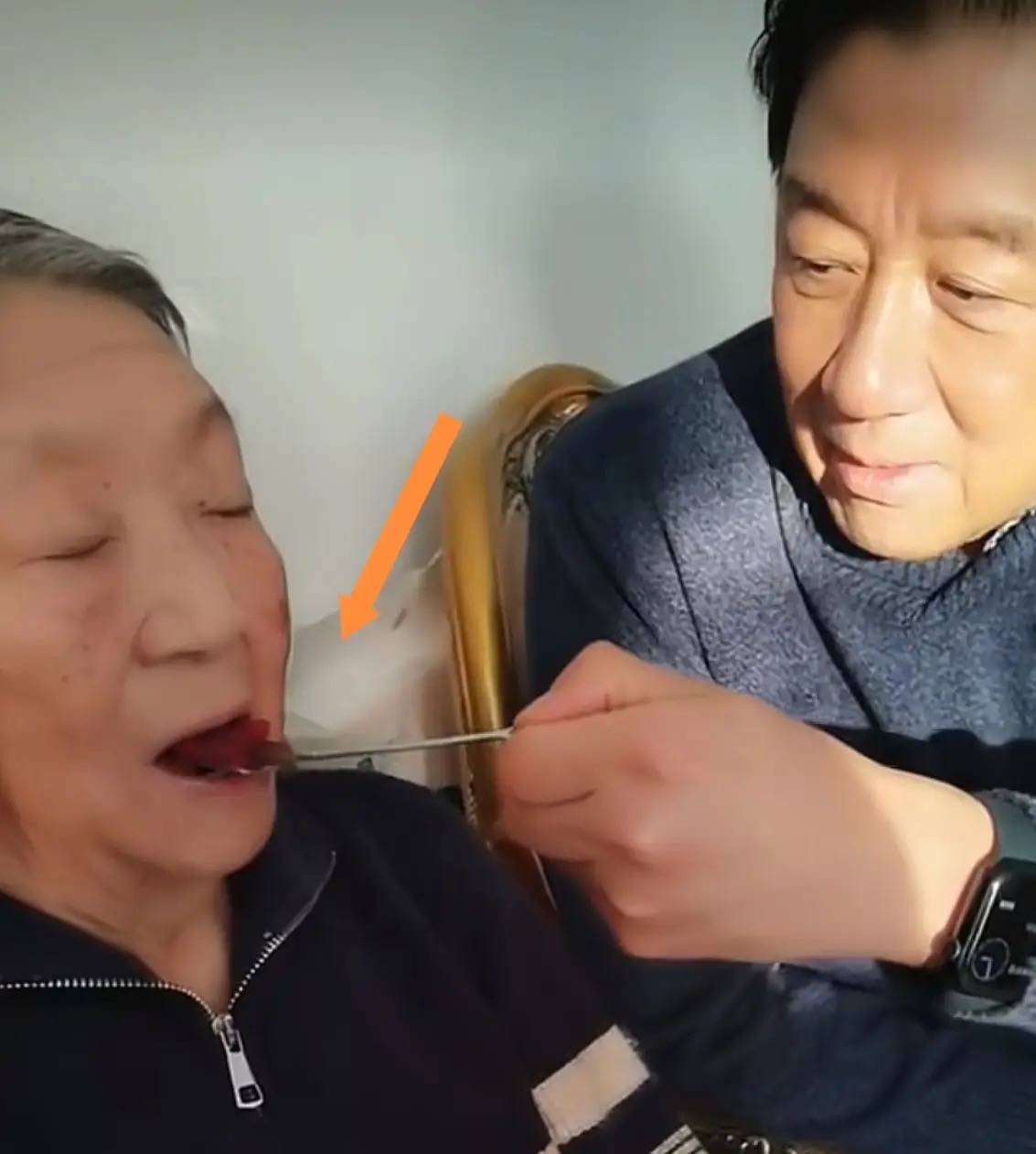 丁勇岱用小勺把水果挖出来,小小的一块递到母亲嘴边。他细心的照顾着母亲,整个过程都很细心,讲话和动作特别温柔。