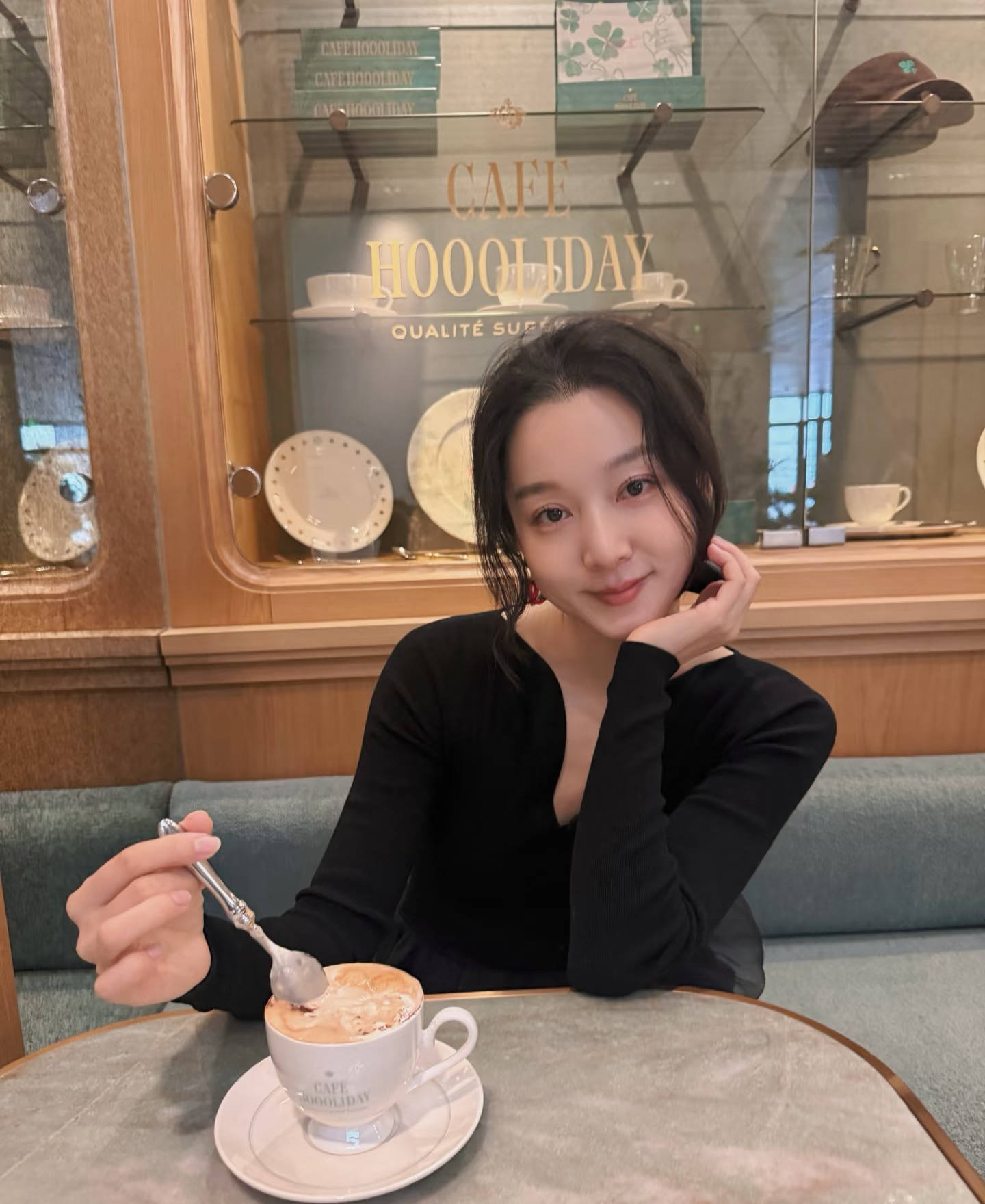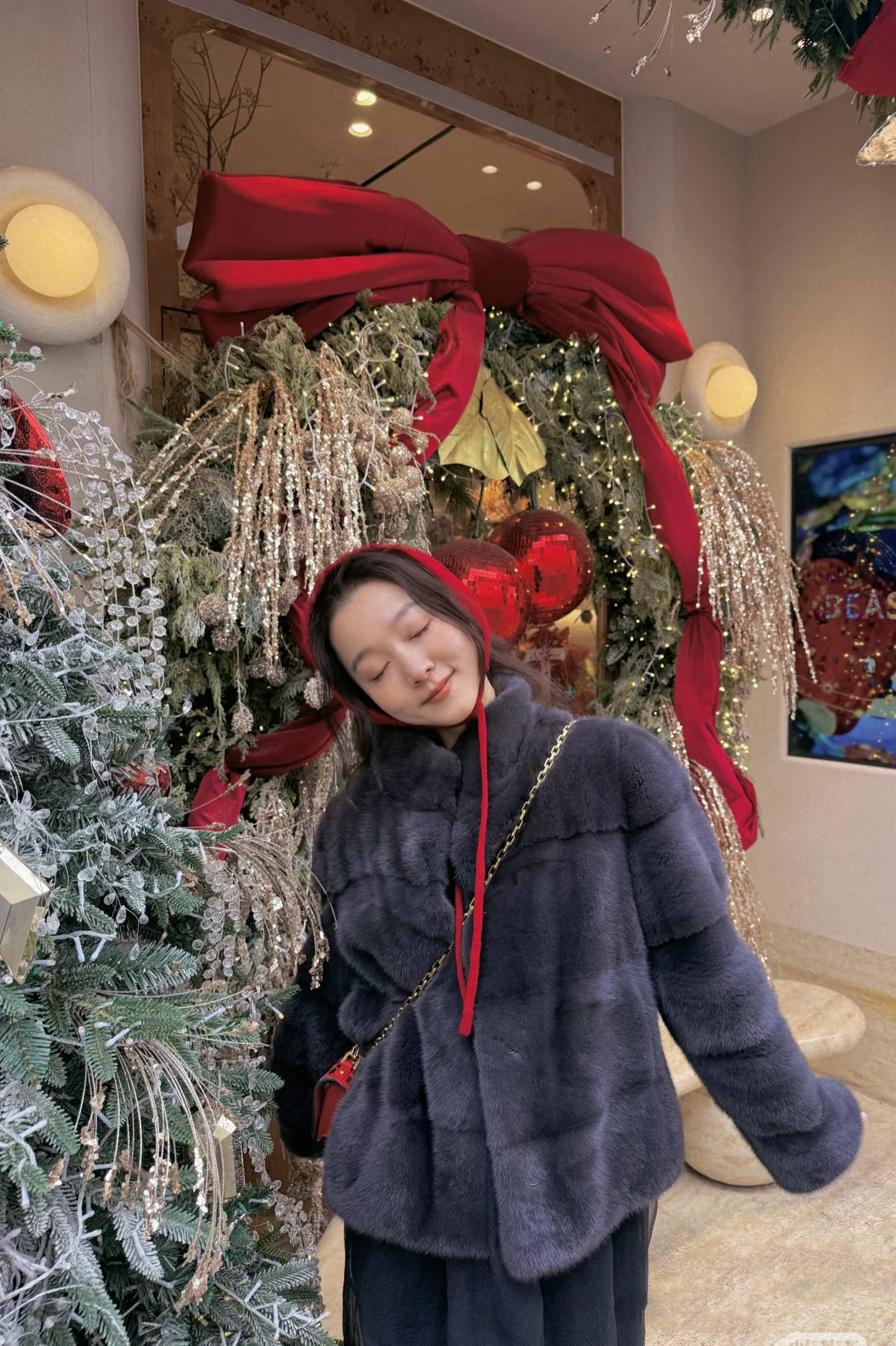与圣诞节最应景的就是各种红色配饰了,夏露不仅戴了小红帽还格子间安排了红色中古包,这款中古包亮闪闪的与暗色服装更配,最适合这种节日背了。