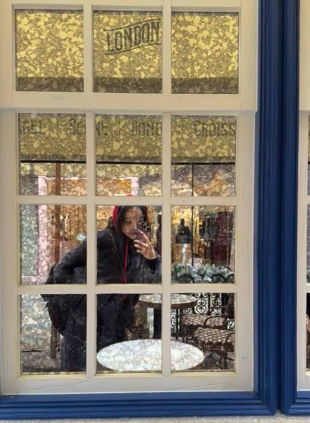 在白色玻璃窗前,夏露侧着身子拍照,身体稍微前倾,单手插兜,看着手机屏幕,这种对镜自拍的pose就很好看。
