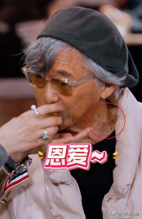 就在林子祥吃的一瞬间,镜头高清拍到了林子祥的脖子。