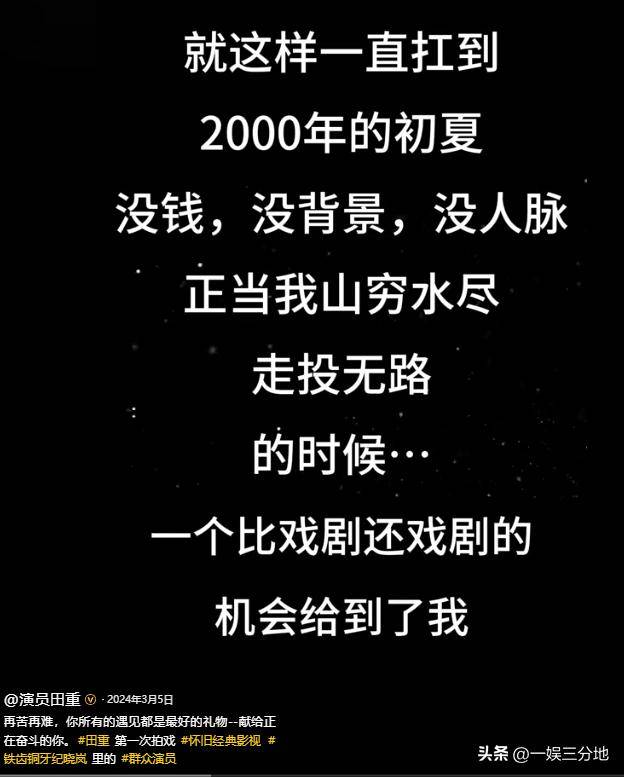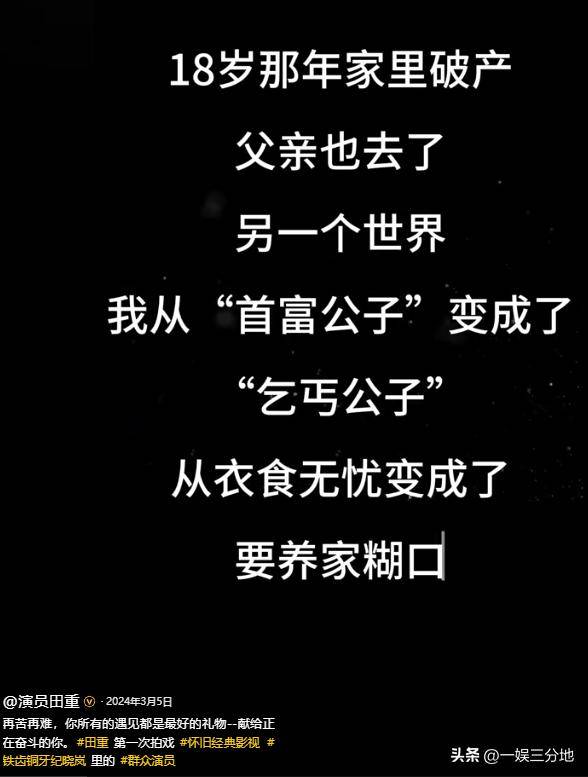 田重自爆,18岁时父亲去世后,他从首富公子变成了乞丐公子,而《铁齿铜牙纪晓岚》一个小小的角色,打开了他的演绎生涯。