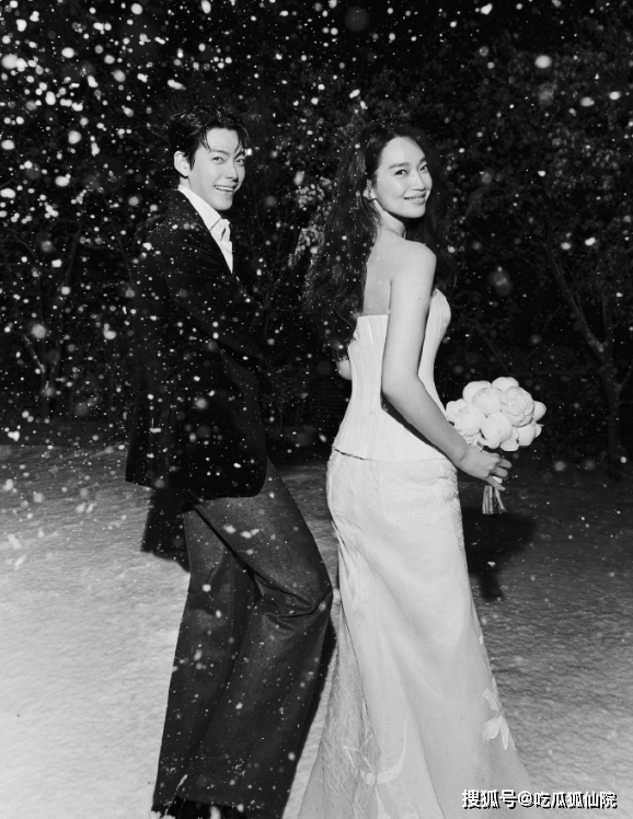 婚纱照中,申敏儿身着简约白裙,手捧鲜花,笑容温柔,金宇彬则身穿笔挺西装,身姿挺拔,两人在纷飞的大雪中牵着手回眸,画面十分浪漫。