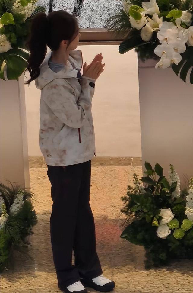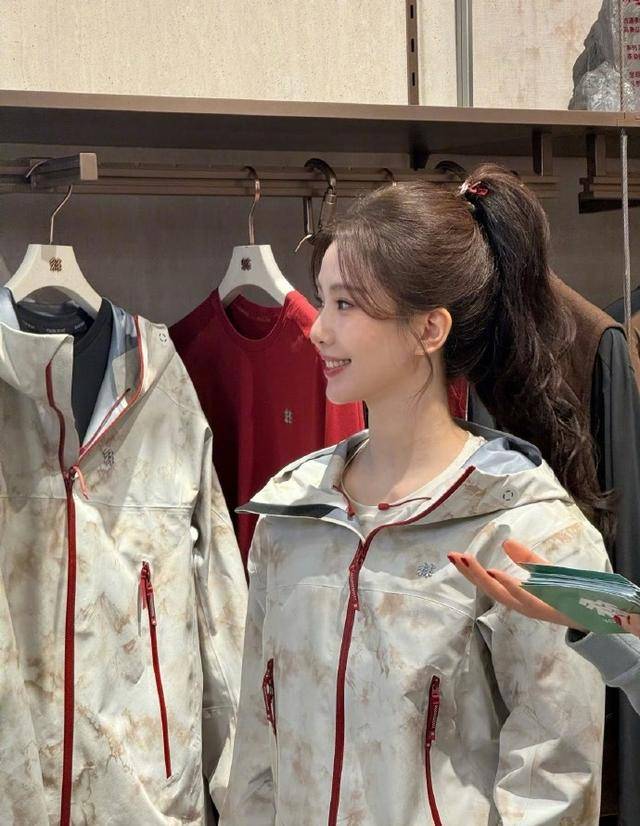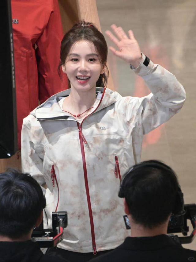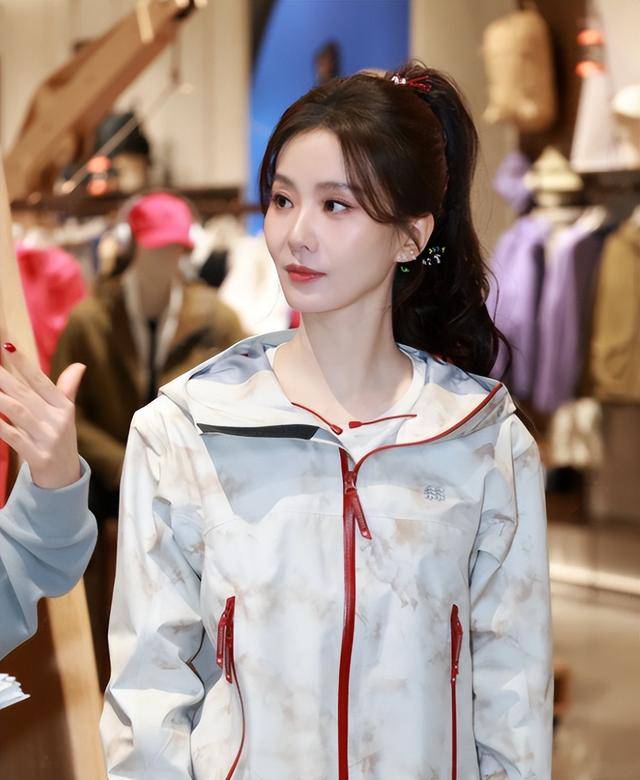 精修图里她穿着浅蓝与米白拼接的冲锋衣,搭配黑色裤子,梳着高马尾,看起来青春活力,天鹅颈也很优雅。
