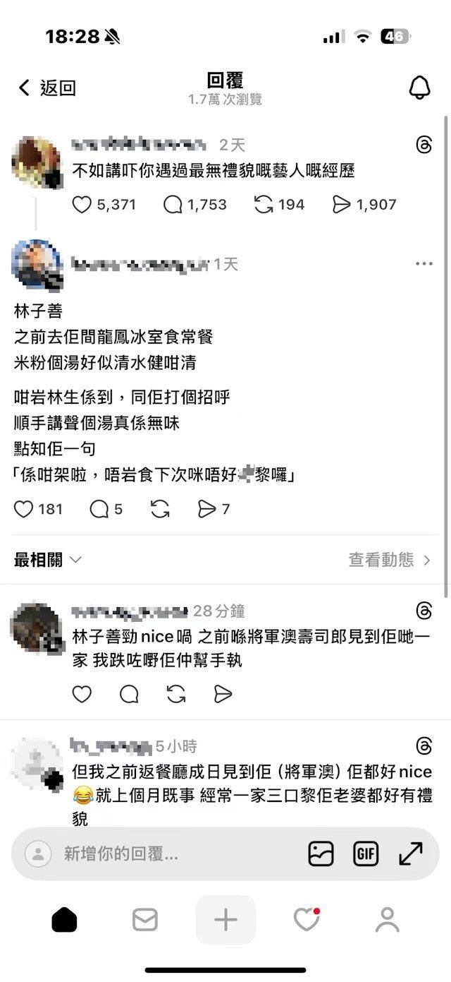 所以该网友将这个经历分享了出来,认为林子善是他认为的没有礼貌的艺人,不过在这个网友的留言下,还是可以看到有其他的网友留言反击。