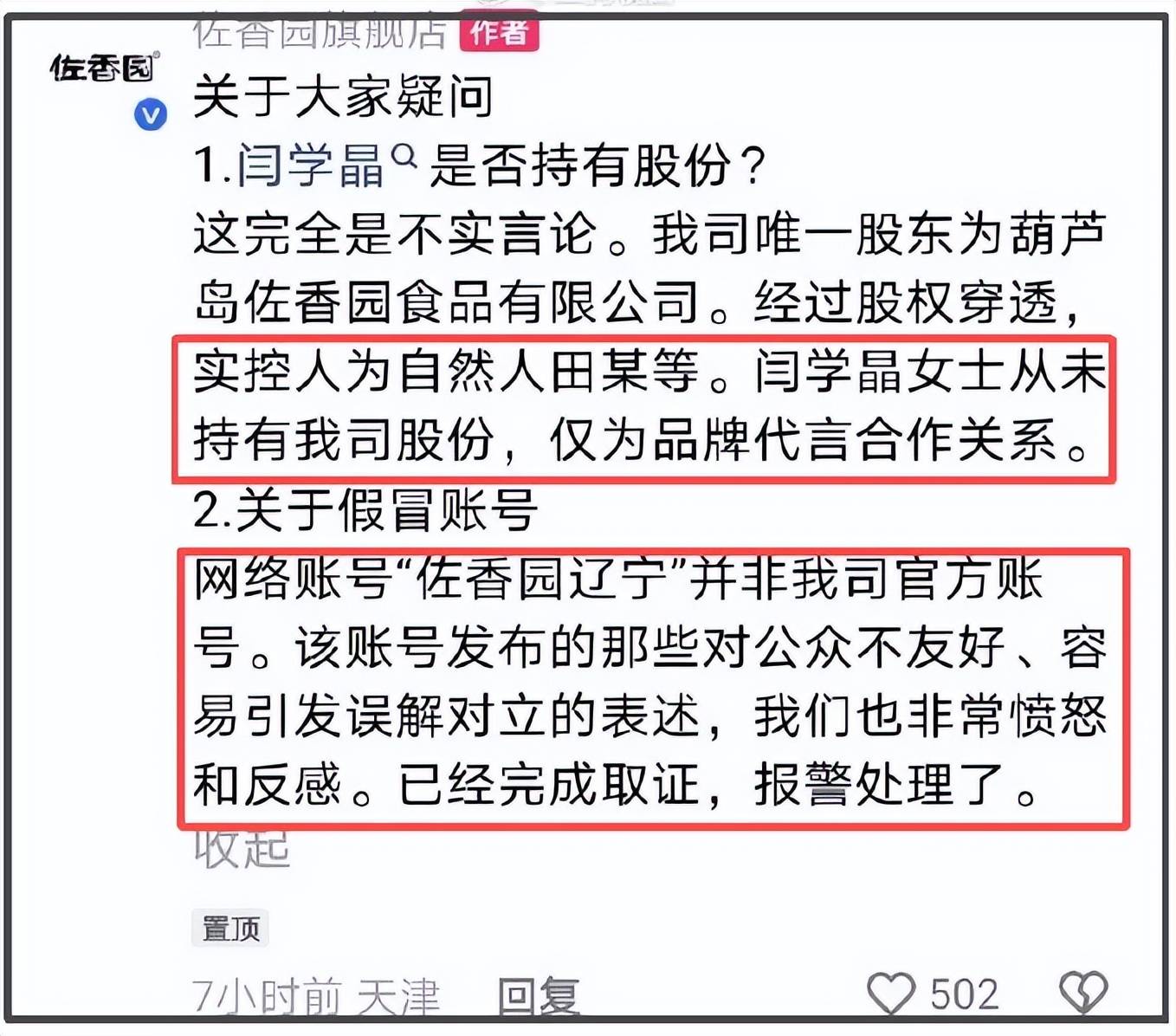 而今,品牌方宣布解约后,也澄清闫学晶并非股东,只是代言合作关系,还否认之前维护闫学晶的账号是官方账号,对此已报警。