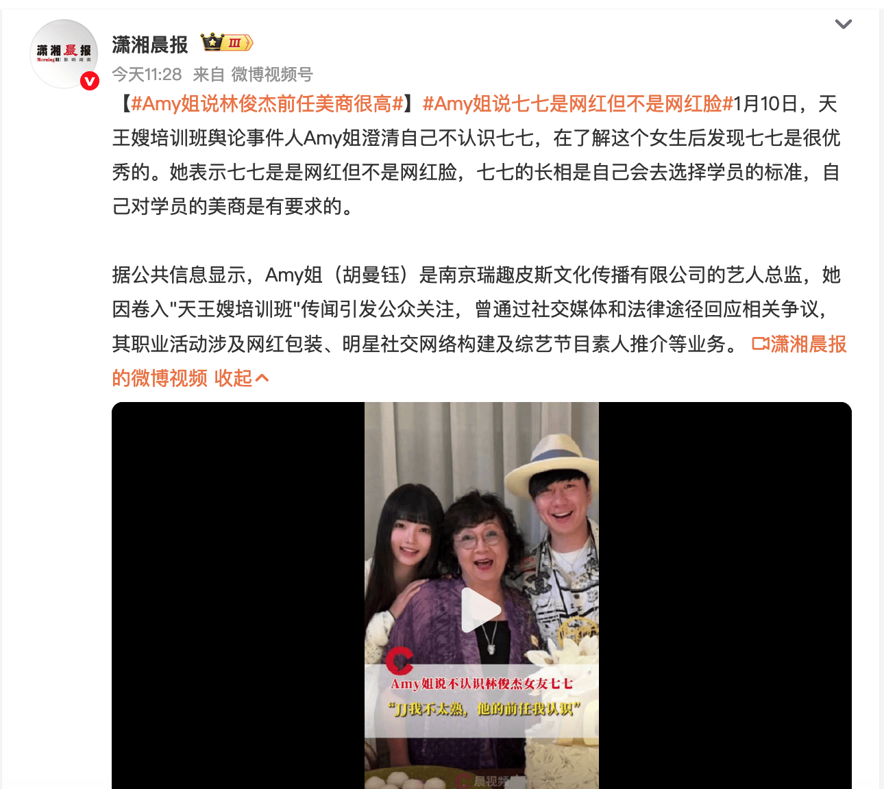 1月10日,天王嫂培训班舆论事件人Amy姐澄清自己不认识七七,在了解这个女生后发现七七是很优秀的。她表示七七是是网红但不是网红脸,七七的长相是自己会去选择学员的标准,自己对学员的美商是有要求的。#Amy姐说林俊杰前任美商很高#