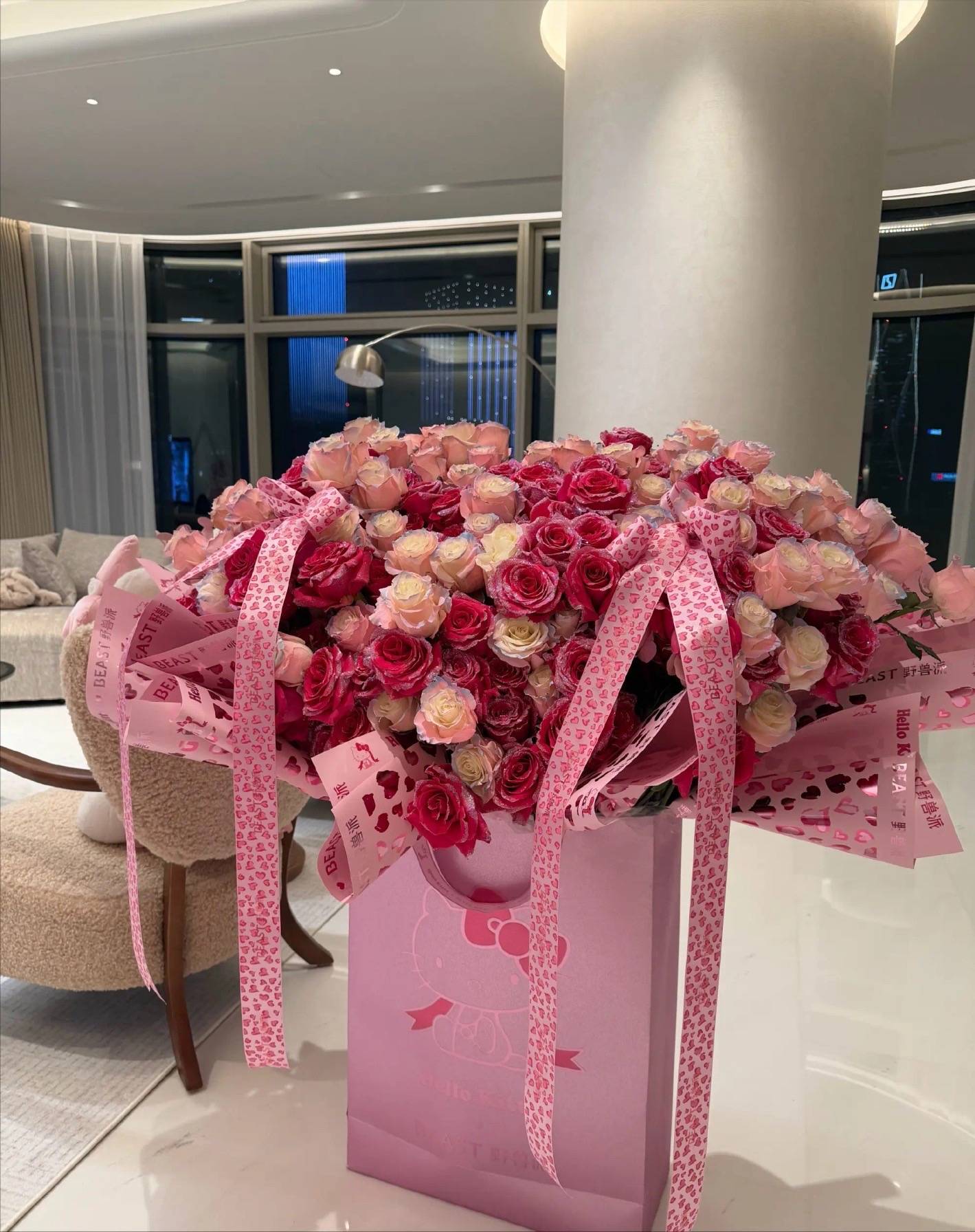 重头戏就是这大束的玫瑰花,99多粉红相间的玫瑰花格外浪漫,就连盛花的历代都是hello kity的图案。