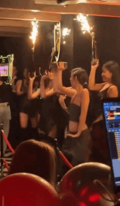 视频里,灯光昏暗、人挤人,香槟配着仙女棒被点燃,明火在密闭空间里直冲天花板。音乐炸裂,人群沸腾,Jennie跟着节奏舞动,看得出情绪不错,玩得也很投入。