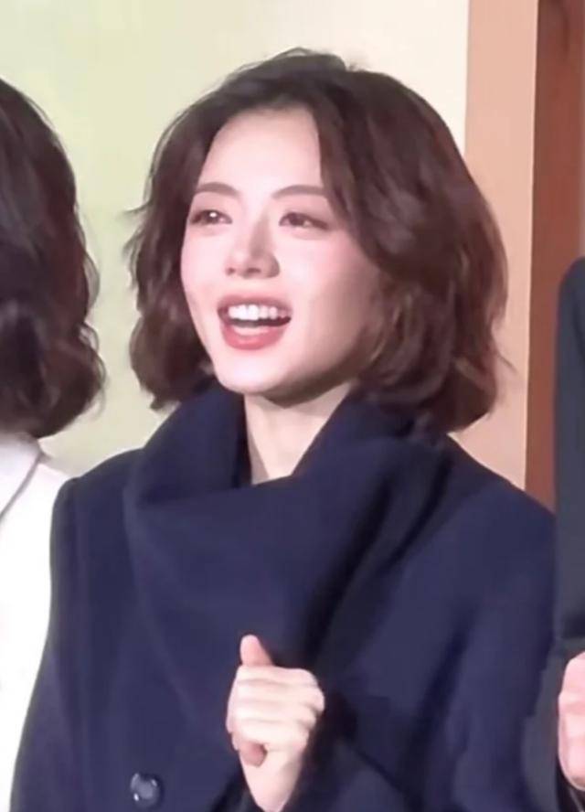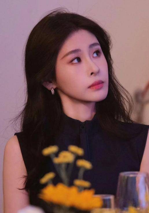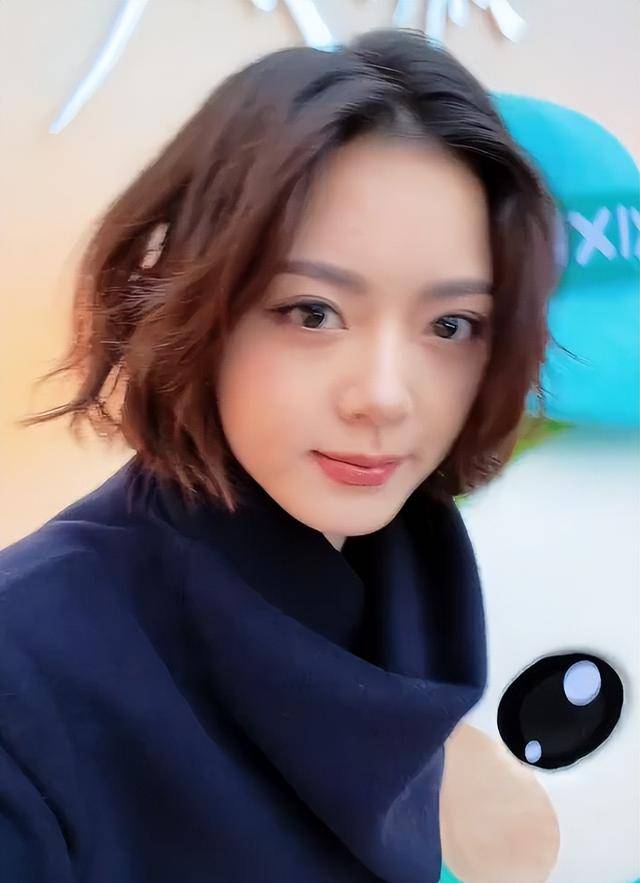 她的发型是利落的中短发,发尾修剪得整齐干练,额前的头发向后梳起,露出饱满的额头,气场十足。
