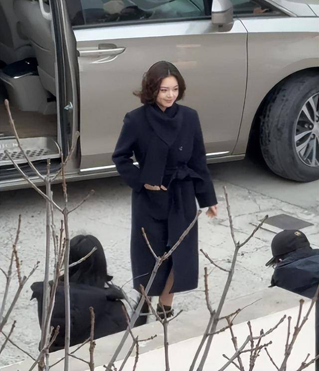 她穿着一袭蓝色的大衣,发型是四边齐,发尾微微卷曲,衬得她脸蛋小巧精致。