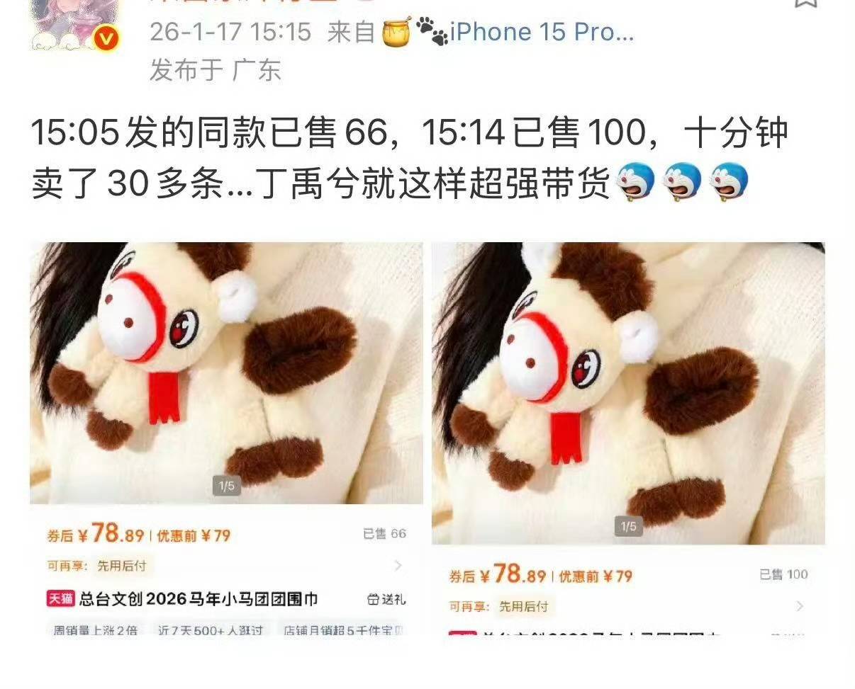 这场乌龙还意外带火了丁禹兮的“马年限定穿搭”。红色毛衣衬得他气色红润,黑色外套干练利落,小马围巾和小马包的组合萌感十足,既符合春晚的喜庆氛围,又不失年轻人的时尚感。网友们纷纷表示:“就算是‘吊牌’,也不妨碍这套穿搭好看”“求央视文创赶紧上架同款围巾,我也想get春晚限定款” 更巧的是,当日丁禹兮还官宣成为老凤祥全球代言人,品牌方透露,受围巾热议的带动,部分同款关联商品直接售罄,商业号召力可见一斑。网友笑称:“丁禹兮这波是‘乌龙带火销量’,连央视都得谢谢他的‘吊牌效应’”