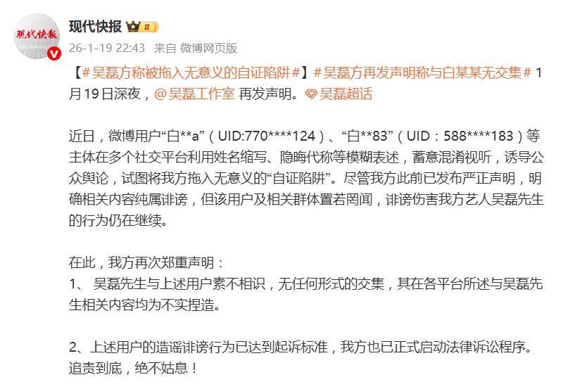这还没完。1月19日晚,工作室再发声明,态度强硬升级。声明核心直击要害:第一,重申与所谓“白珊珊”素不相识,毫无交集;第二,确认诽谤行为已达到起诉标准,正式启动法律程序,追责到底;第三,也是最犀利的一点——明确表示“没有义务和必要对毫无根据的恶意揣测逐一自证”,但绝不代表纵容,法律武器已然亮出。