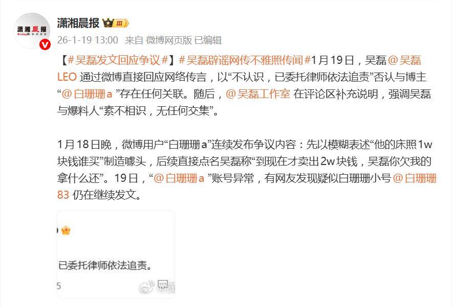 一句“吴磊你欠我的拿什么还”,配上“1万元一张床照”的叫卖,让微博用户“白珊珊a”在1月18日成功点燃了内娱舆论的炸药桶。然而,这场看似来势汹汹的爆料,却在短短24小时内,上演了一出从嚣张造谣到光速道歉的荒唐闹剧。