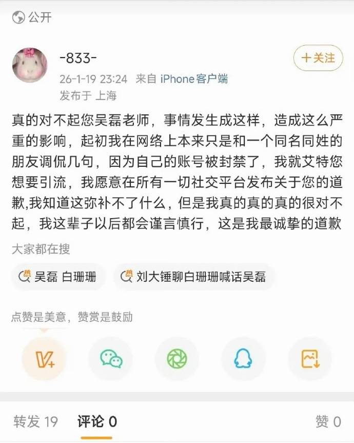 这边吴磊方步步为营,那边造谣者却开始漏洞百出。先是“白珊珊”辩称“账号被盗”,结果被微博官方亲自打脸:经核查,账号登录设备无异常,双重验证未触发,封号纯粹是因为发布违规内容。眼看谎言被戳穿,1月19日深夜,白珊珊用关联账号发文道歉,改口称起初只是与“同名同姓者”开玩笑,因原号被封才“艾特吴磊引流”,并承诺今后“谨言慎行”。