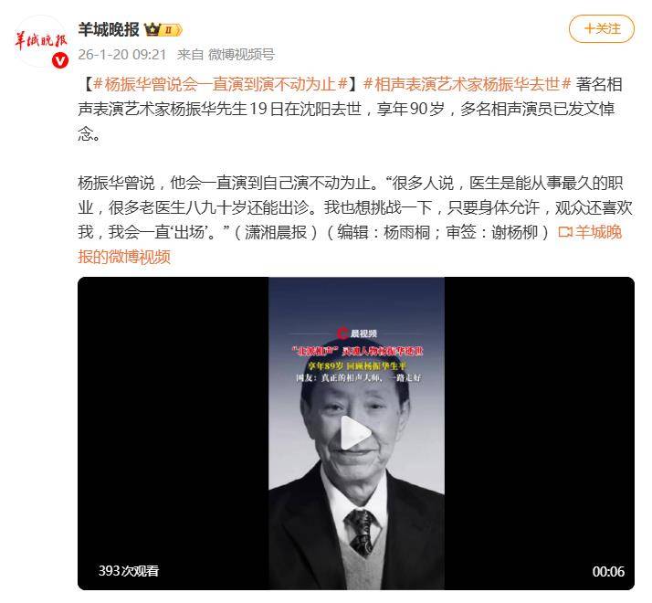 据1月20日报道,1月19日,著名相声表演艺术家、辽宁省非物质文化遗产“沈阳相声”代表性传承人杨振华先生在沈阳逝世,享年90岁。这位被沈阳观众誉为“辽宁曲艺界台霸子”的艺术家离世,标志着一个以辛辣讽刺与大胆创新著称的相声时代的落幕,引发了相声界与公众的深切追忆。