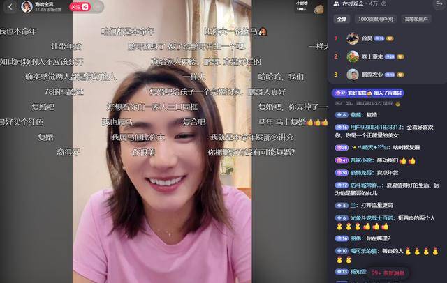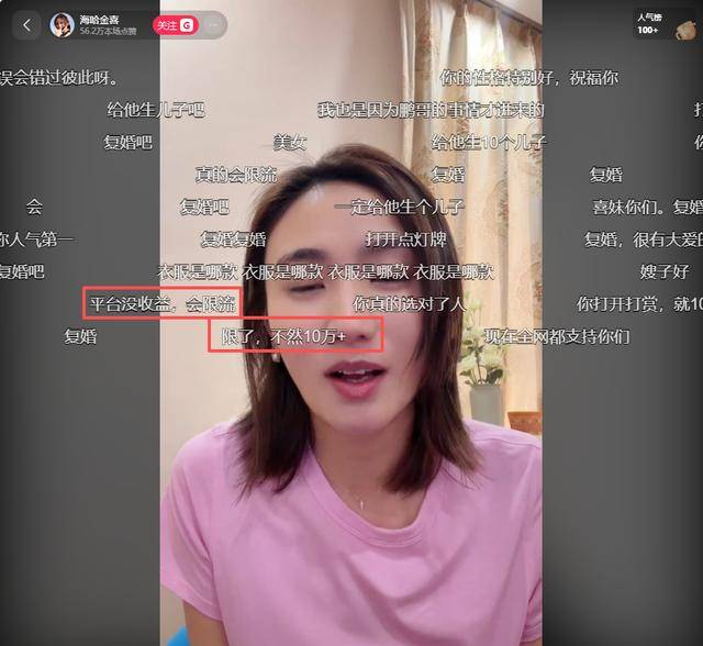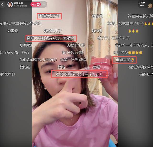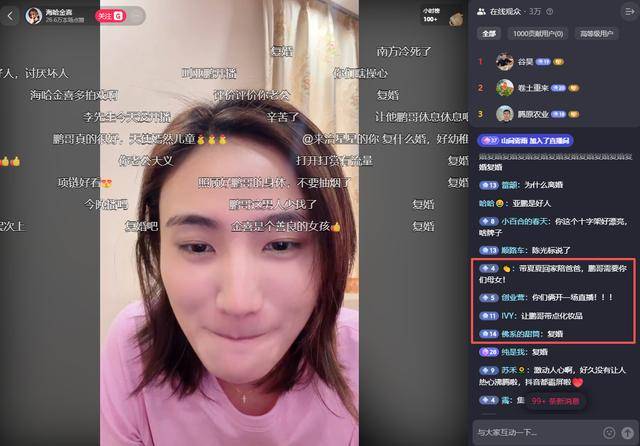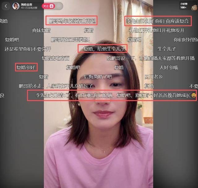 刚开播不久,直播间就高达4万人同时在线,弹幕也刷得飞快,多数网友直接劝起了复婚,还有人开玩笑让海哈金喜再给李亚鹏生儿子,甚至说“生10个”“组个足球队”。