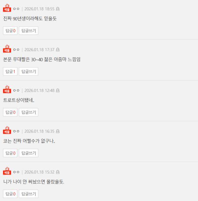 评论区迅速被难以置信的声浪淹没。许多网友直言,其外貌状态看起来更像是三四十岁:“说实话,就算你说她是90年代出生的我也信。”“帖子里的舞台截图中,她像三四十岁却试图显年轻的女人。”更尖锐的评论则直接将矛头指向了可能的整容手术,并认为结果堪称“灾难”:“鼻子的问题真是没办法忽视啊……”“看起来像是整形医生搞砸了。”“为什么她这么显老?整容后反而像老了30岁…她是做了让人变老的手术吗?