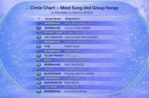 根据这份2025年按月统计的练歌房消费者数据,在入选的16首热门歌曲中,经典老歌占据了绝对主导地位。其中,最具统治力的当属BIGBANG,他们一人独揽七首上榜歌曲,并强势包揽榜单前两位。少女时代2017年发布的《Into the New World》也稳居第三。相比之下,新生代力量显得势单力薄,仅有IVE、aespa、BLACKPINK、(G)I-DLE、BABYMONSTER等少数组合及EXO、ALLDAY PROJECT的作品零星在列。