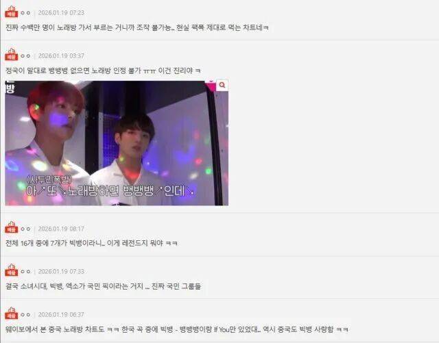 这份基于数百万人实际点唱行为的榜单,被网友称为“残酷的现实检验”。数据一出,立刻引发了海内外粉丝的热议。有韩国网友感慨:“数据根本不可能造假…国民心头好还是少女时代、BIGBANG和EXO,他们不愧是国民级组合。” 更有人引用防弹少年团成员柾国的话调侃:“没有《Bang Bang Bang》的卡拉OK是不完整的,这话简直真理!”
