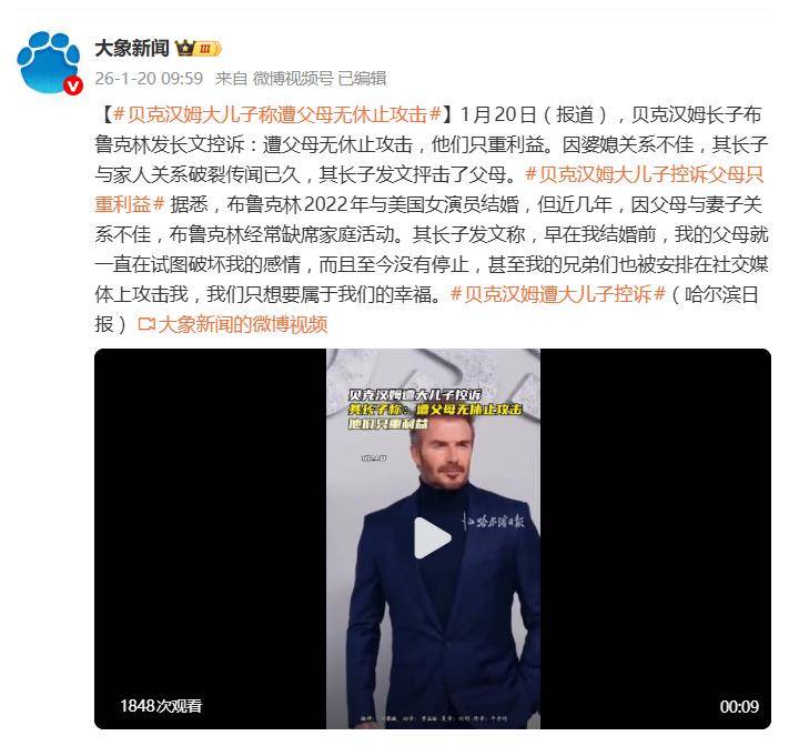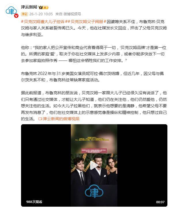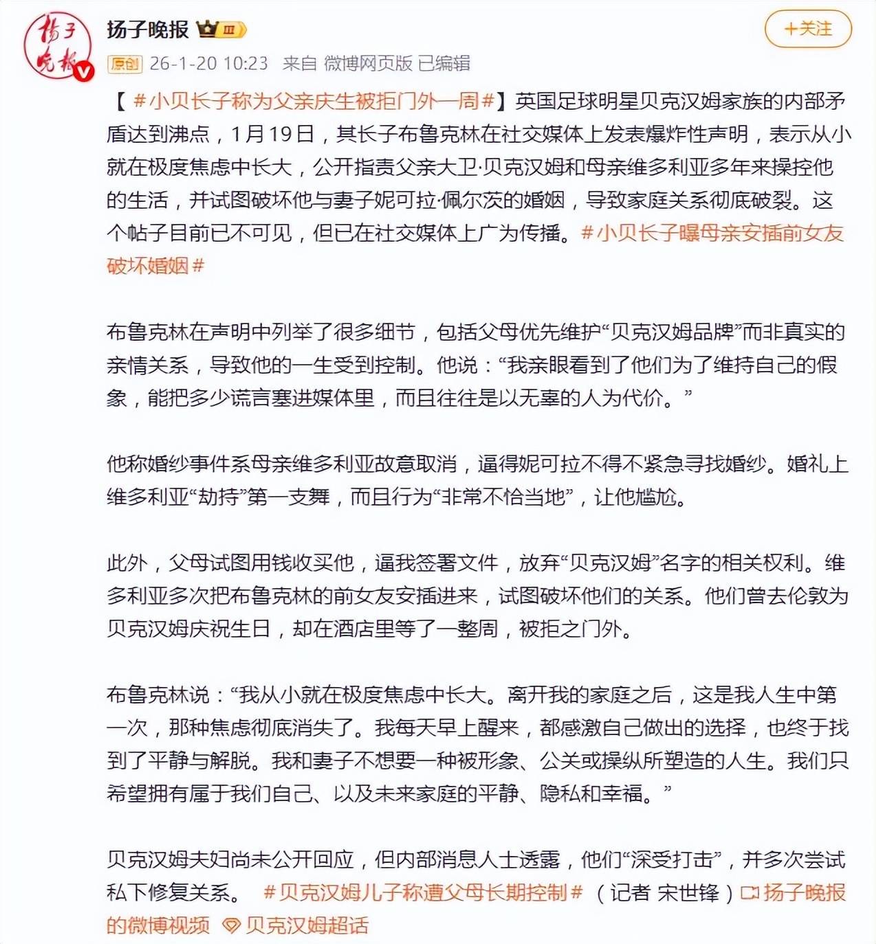 英国足球巨星大卫·贝克汉姆与时尚偶像维多利亚精心构筑的“全球第一明星家庭”滤镜,被一纸长文击得粉碎。据1月20日报道,其长子布鲁克林·贝克汉姆在社交媒体上发表爆炸性声明,公开控诉父母多年来为维护“贝克汉姆品牌”而操控家庭成员生活、破坏其婚姻,并明确表示拒绝和解,将这场酝酿已久的豪门家庭矛盾彻底摊在了全球公众面前。
