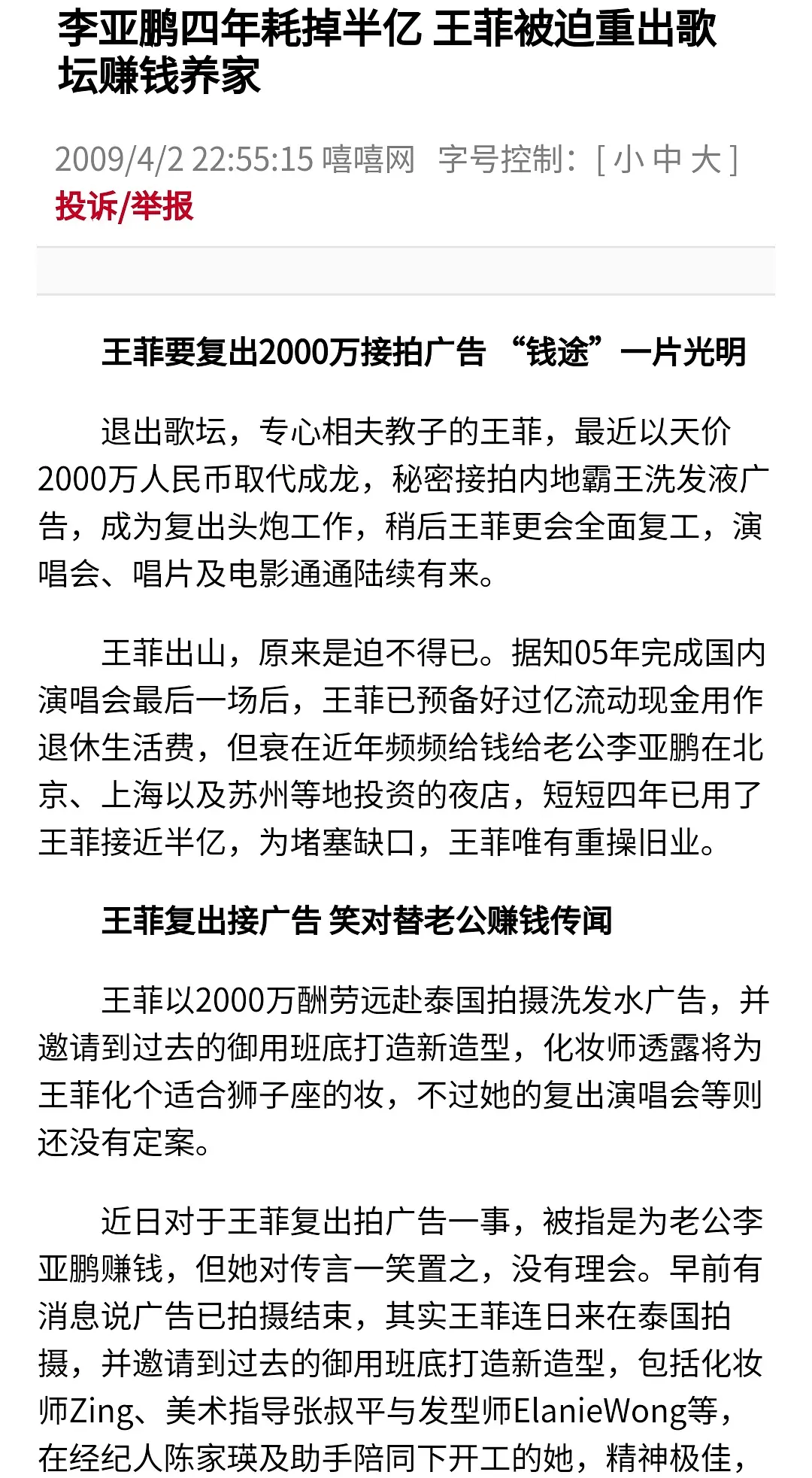又有八卦旧闻提及,王菲2011年复出开演唱会,就被猜测与李亚鹏的投资困境有关。离婚后,李亚鹏的债务雪球越滚越大,从四千万到被强制执行,具体数额已成谜团。