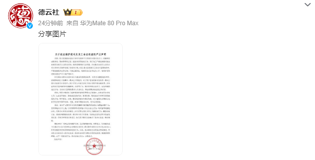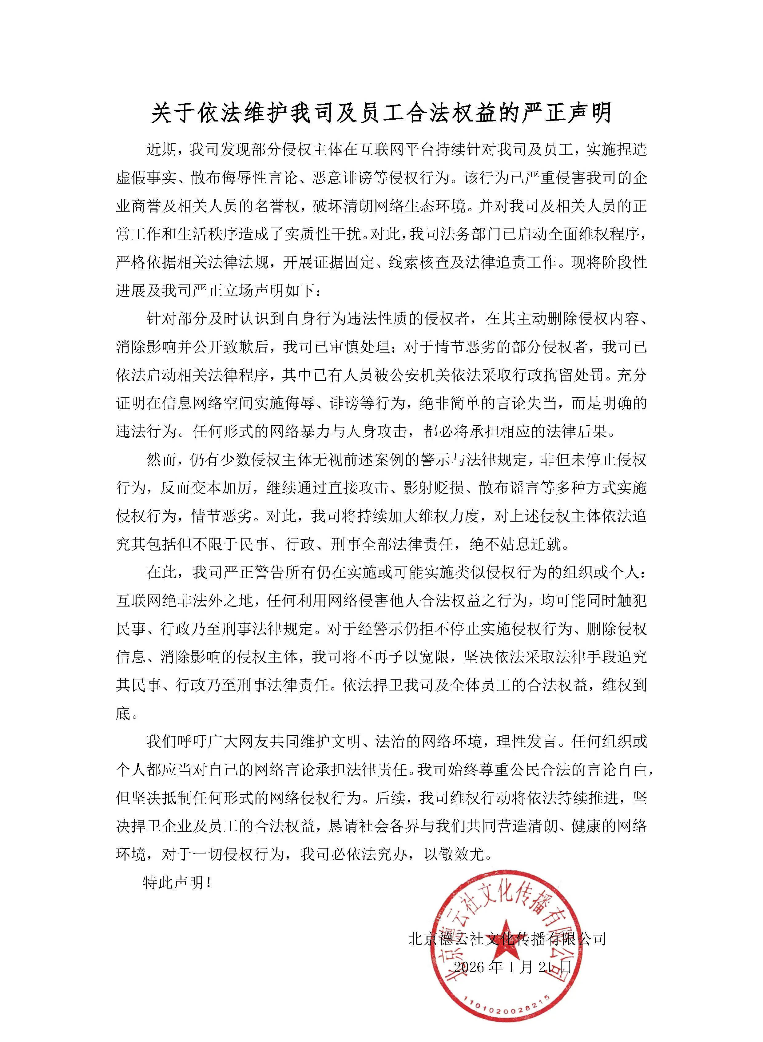 声明强调:“我们呼吁广大网友共同维护文明、法治的网络环境,理性发言。任何组合或个人都应当对自己的网络言论承担法律责任。我司始终尊重公民合法的言论自由,但坚决抵制任何形式的网络侵权行为。”