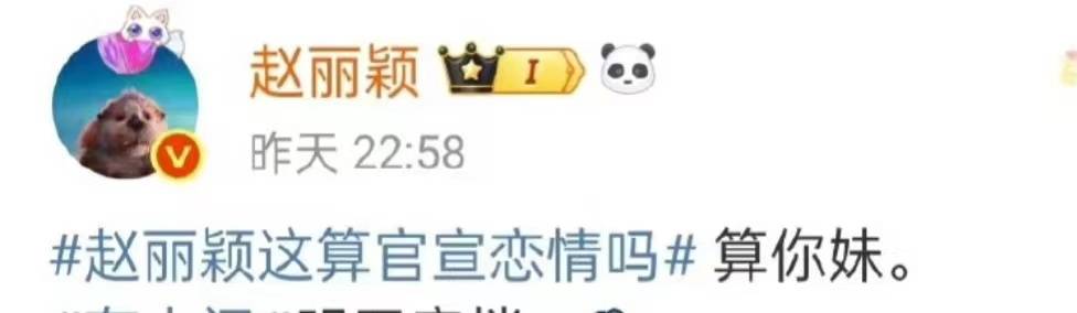 面对“#赵丽颖这算官宣恋情吗#”的热搜话题,她用“算你 妹”三字果断回击,语气强硬,毫无模糊空间。这种表达虽非正式辟谣,但在语境中已构成对恋情传闻的彻底否定。