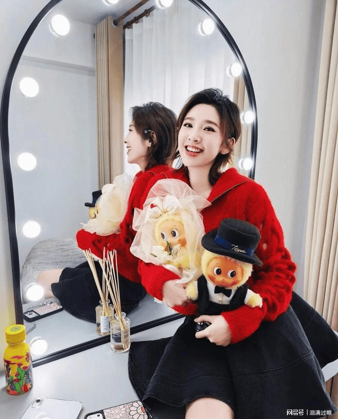 仔细观察照片背景,不难发现这是在家中拍摄。桌上摆放的卡通瓶子、一对幸福的拉布布玩具,无不透露出主人未泯的少女心。这些充满童趣的摆设,与唐艺昕 married but still girly 的状态形成有趣呼应——婚姻并未磨灭她的天真,反而在伴侣的呵护下得以保留。
