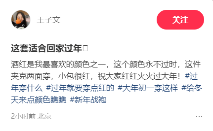在2月12日,王子文晒出自己的美照,还配文:这套适合回家过年,酒红是最喜欢的颜色之一,感觉不会过时,而且又可以当皮草还可以当夹克两面穿非常的适用,没想到王子文这么快就晒出自己的新年战袍了,穿着酒红色皮草回家过年洋气又喜气。