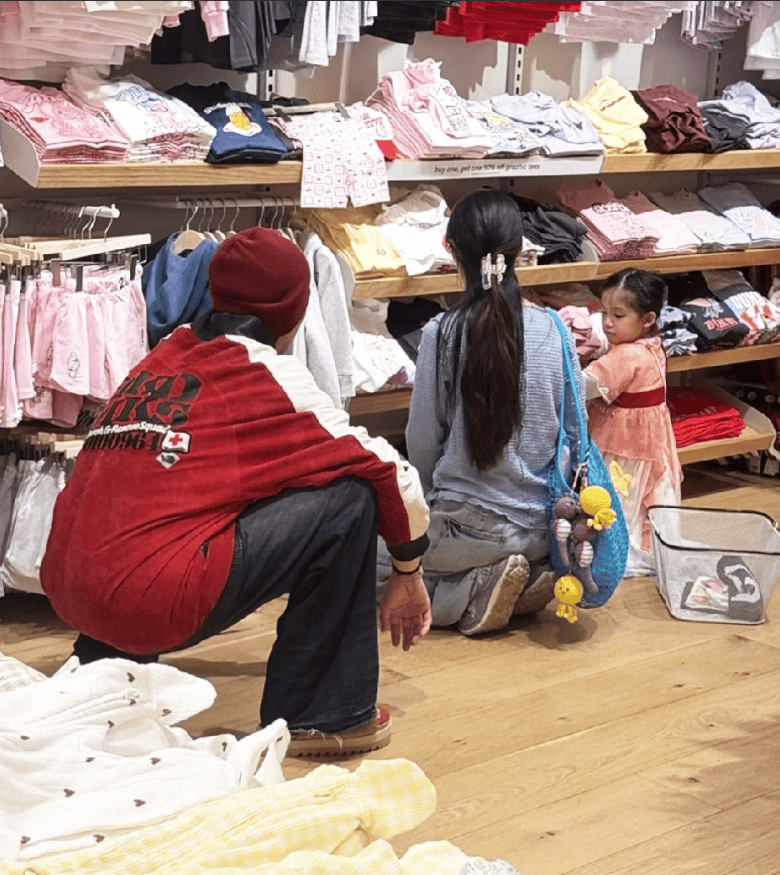 向佐应该是带着孩子单独飞的,到新加坡会合,没想到刚到新加坡,郭碧婷就带着女儿来买衣服了,向佐在旁边蹲着,郭碧婷为了更好的陪伴女儿选择直接跪在地上,真的是高质量带娃了,披着头发放个鲨鱼夹美的好温柔啊!