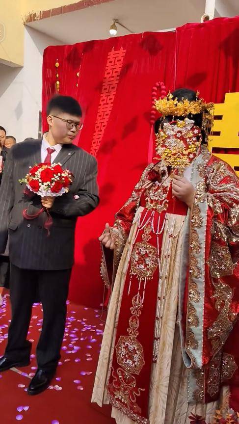 再看新郎,身材高大,长相憨厚,和朱雪梅站在一起,还真有种夫妻相,看着挺般配。