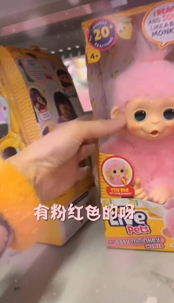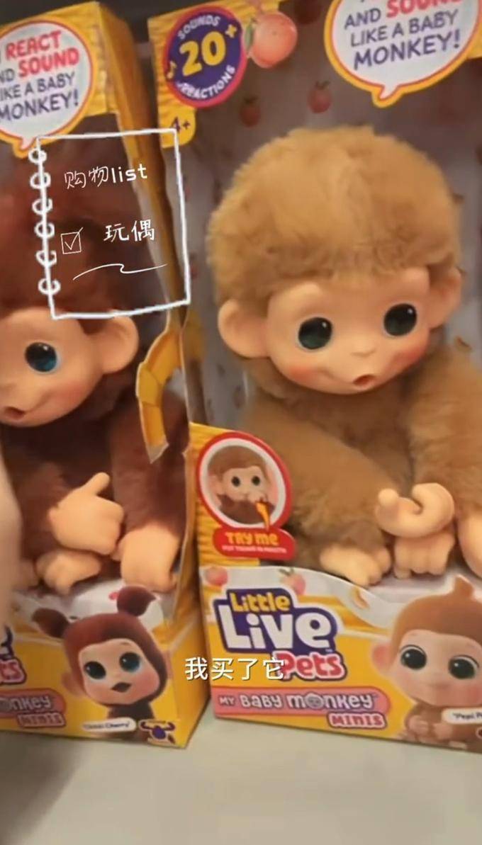 她为自己购买了一个玩具,这是Little Live Pets My Baby Monkey Minis(我的猴子宝宝迷你版本)的互动毛绒玩具,由Moose Toys制作。当我向后翻看时,发现了粉红色的东西,看起来像个快乐的小孩,我果断地放弃了之前的那个,并轻轻触摸了之前的那个,表示歉意。这一微小的细节透露出她内心深处有一个小女孩的存在。