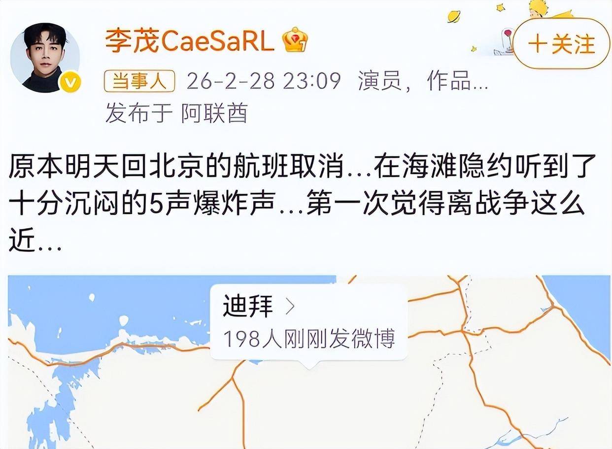 这三个字听着简单,搁平时可能就是矫情,但搁在那会儿,真能把人眼泪给说出来。为啥?因为他老婆弦子,就是唱《不得不爱》那个,IP地址也显示在阿联酋。两口子带着孩子和家人,就躲在朱美拉海滩的酒店里。李茂自己说,他在海滩上隐约听见五声爆炸,特别沉闷,活了三十九年,头一回觉得战争这玩意儿离自己这么近。咱们这些在国内刷手机的人,可能觉得战争就是新闻联播里那几十秒的画面,但对于他们来说,那是窗外真实的火光,是手机里突然弹出的轰炸警报,是不知道下一秒钟自己还能不能喘气的恐惧。