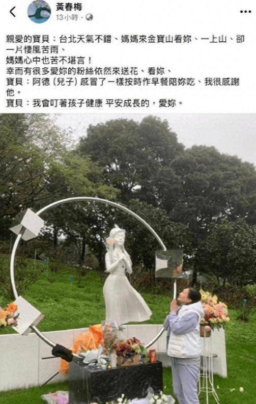 3月8日 那天,S妈 分享了她前往金宝山 探望大S的 经历。当她再次看到大S的雕像 时,心中不禁涌起了一丝伤感 。她还 写下了这样的配文: 在上山之前 ,台北的气 候一直很好, 但每次上山 都是风雨 交加, 这让她的心 情变得更 加沉重。之前 ,她总 希望看 到具俊晔陪伴 在S妈 身边,这样她的心 情会稍微好一 些。