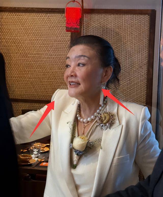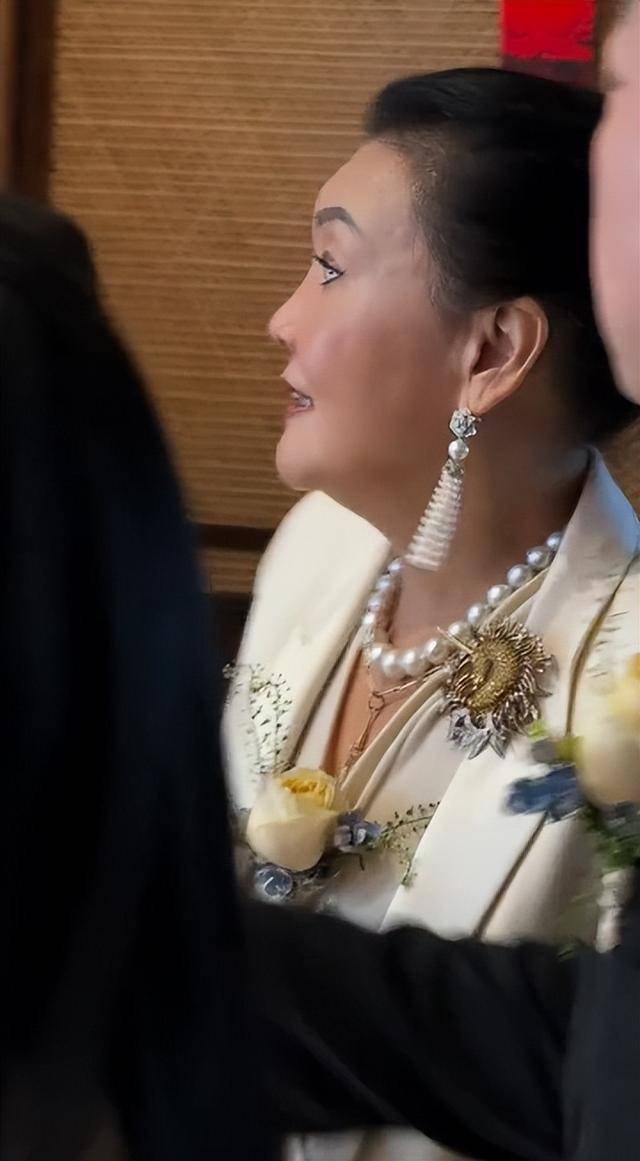再看张兰却是完全相反的状态,她穿了件白色V领西装,脖子上挂着珍珠项链,还有胸针和玫瑰挂饰,这打扮在人群里特别扎眼。