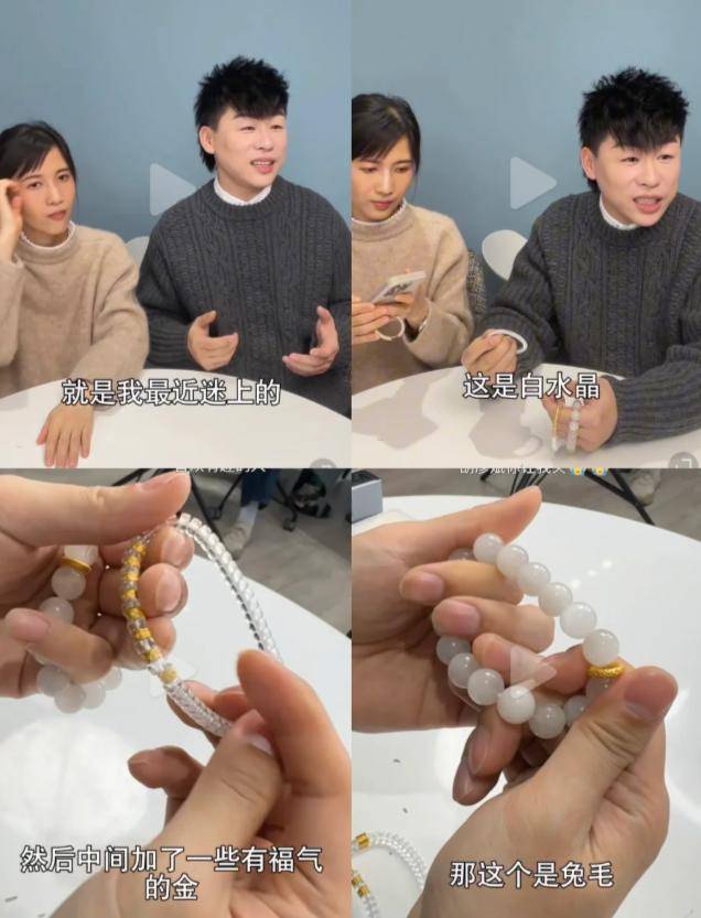 那串手串看着是兔毛手串,整条手链的颜色都很透亮,一看就是戴了挺久、经常盘玩的。