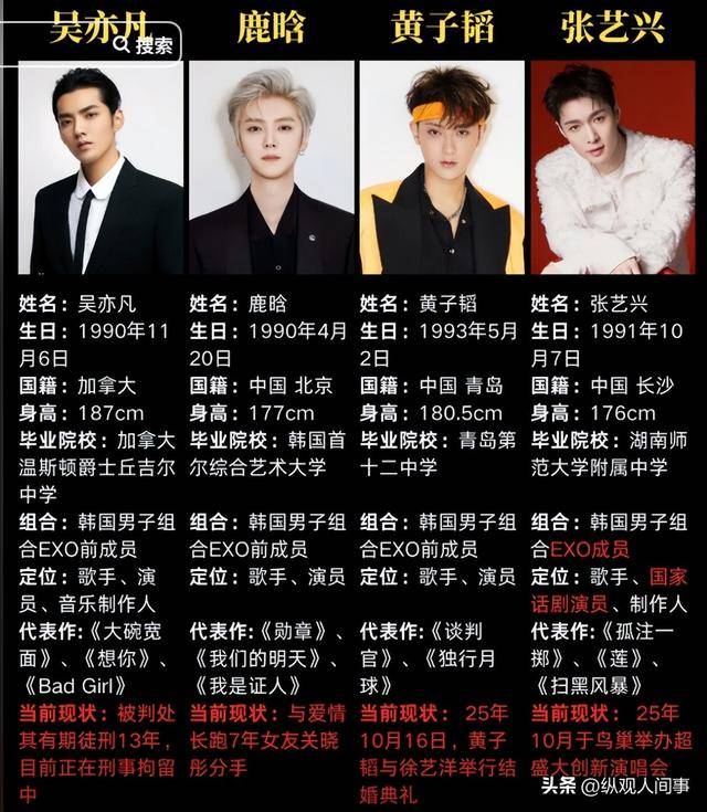 其中一位成员彻底塌房沦为劣迹艺人,鹿晗因公开恋情人气下滑,黄子韬则因各种言行争议口碑起伏。