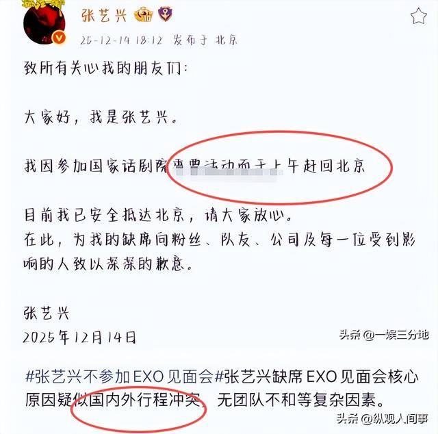 据悉,张艺兴此前确有参与 EXO 大队在韩国的回归相关活动计划,但于 2025 年 12 月 14 日临时取消,其本人称是因需赶回北京参加国家话剧院重要活动。