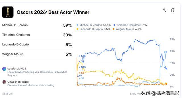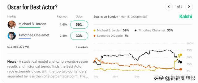 在最佳男主角的激烈角逐中,提莫西·查拉梅与迈克尔·B·乔丹的影帝之争可谓一波三折,一场突如其来的口水战更是直接导致了上亿美元预测市场的剧烈动荡。