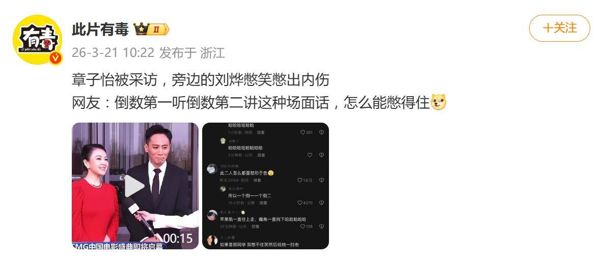 3月20日,CMG电影盛典上的一幕“表情管理失控”戏码,意外抢了典礼本身的风头。当形象大使章子怡身着红色礼服,正严肃阐述电影行业的艺术价值与使命时,身旁并肩而立的老友刘烨,却因全程努力憋笑导致面部扭曲,被镜头逮了个正着。这反差十足的画面瞬间引爆网络,被网友精准调侃为“倒数第一听倒数第二讲场面话”。