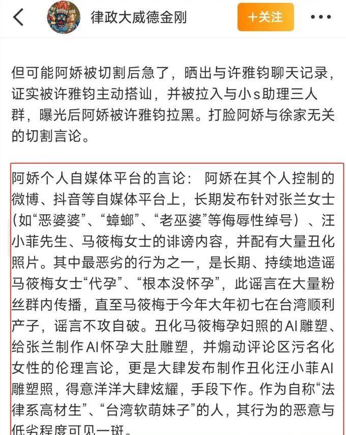 小S 从始至终都 对整个情况 了如指掌,并且还默 许了她的丈夫做出这 样的行为, 这对夫 妇共同 为前姐夫设置 了障碍。 在群 聊中,那 名女性粉丝 的账 户里满是 批评汪小菲的帖子,甚至连马筱梅 也没有被 轻易放过。