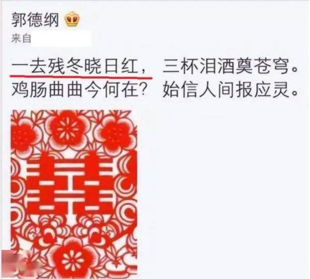 11月20日下午,郭德纲在个人账号上发了一首打油诗:一去残冬晓日红,三杯泪酒奠苍穹。鸡肠曲曲今何在?始信人间报应灵。他还配了一张红双喜图片。