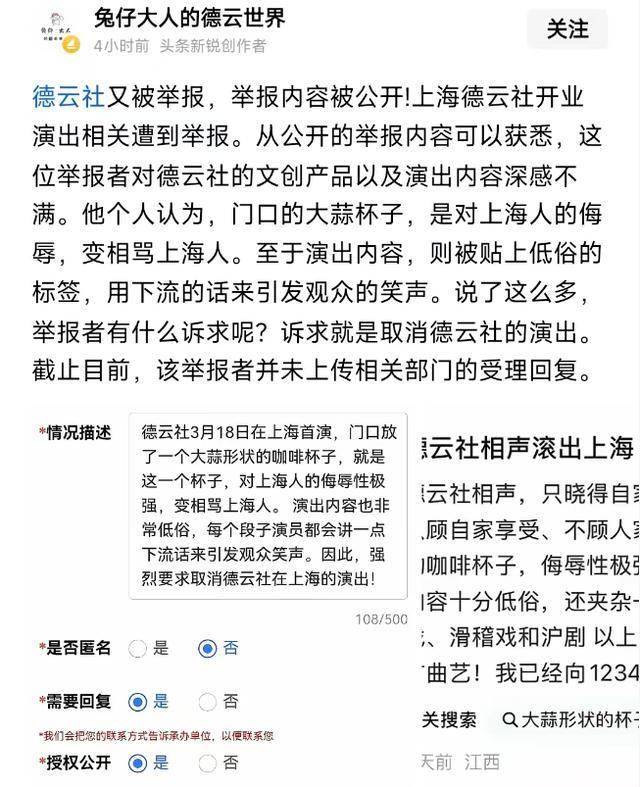 “大蒜咖啡杯”被媒体曝光之后,上海本地自媒体和网友对上海德云社和郭德纲掀起了一波又一波的质疑和吐槽,最后发展到了有人向上海12345进行了举报。