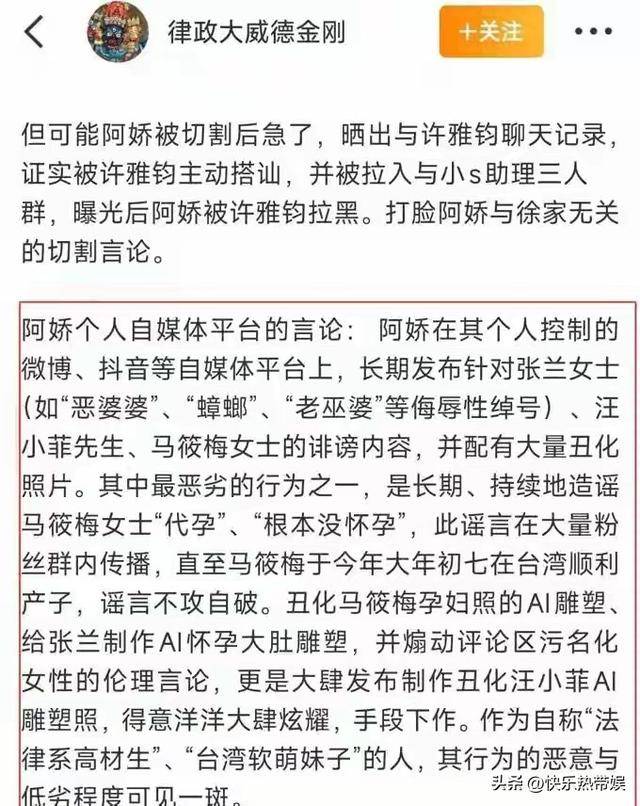 3月20日,律师“大威德金刚”,在微博上爆料,徐家,包括许雅钧在内,高度关联长期网暴汪小菲的粉头,系统的操控舆论,组织各种对汪小菲,张兰,以及马筱梅的网暴。