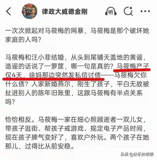 不仅如此,该律师还透露,马筱梅产子的第四天就收到来自徐妈黄春梅的“讨债”信息重翻旧账,马筱梅与汪小菲结婚当天也曾收到这样的信息,其实这些事情跟马筱梅一点关系也没有,不知道为什么抓着不放,但是徐家不希望汪小菲好过的心,太明显了。