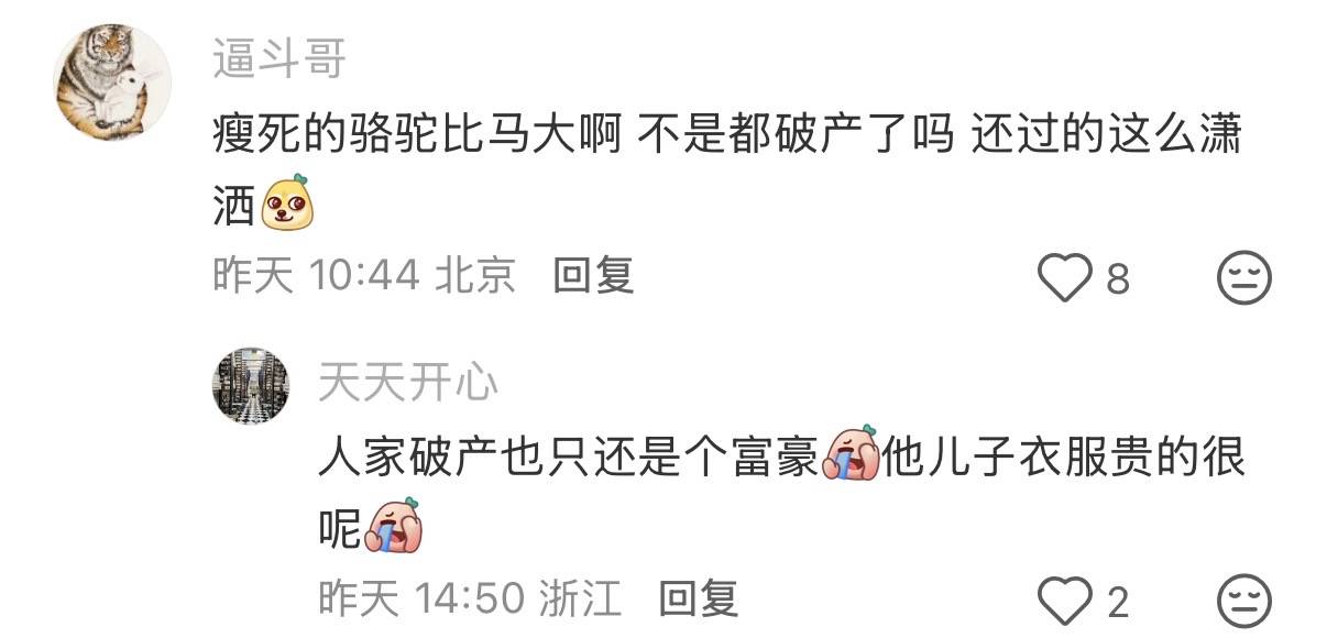 只能说,瘦死的骆驼比马大。人家在破产、也过得潇洒。不光是他儿子的衣服、就连邹市明和冉莹颖的衣服也都很贵,他们习惯了大牌、就不会适应小牌子的衣服。