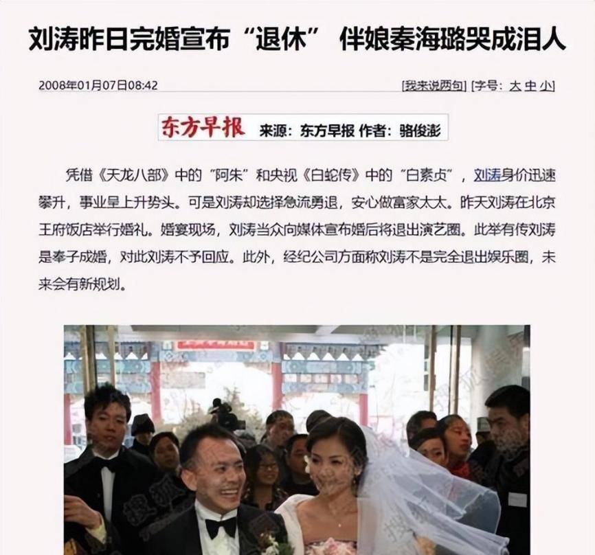 两人举办了当年娱乐圈盛大的豪华婚礼,足足耗资了400多万,刘涛也在婚礼上高调宣布退出娱乐圈,安心在家当豪门阔太。