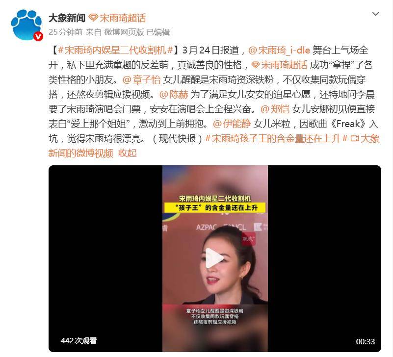 舞台上她是燃炸全场的女团I-DLE成员,舞台下却成了让一众明星家长“头疼”的抢手对象——据3月24日报道,最近,宋雨琦被网友封为“内娱星二代收割机”,这称号可不是白来的。从章子怡到陈赫,从郑恺到伊能静,他们家的小公主们,一个个都成了宋雨琦的“资深铁粉”。