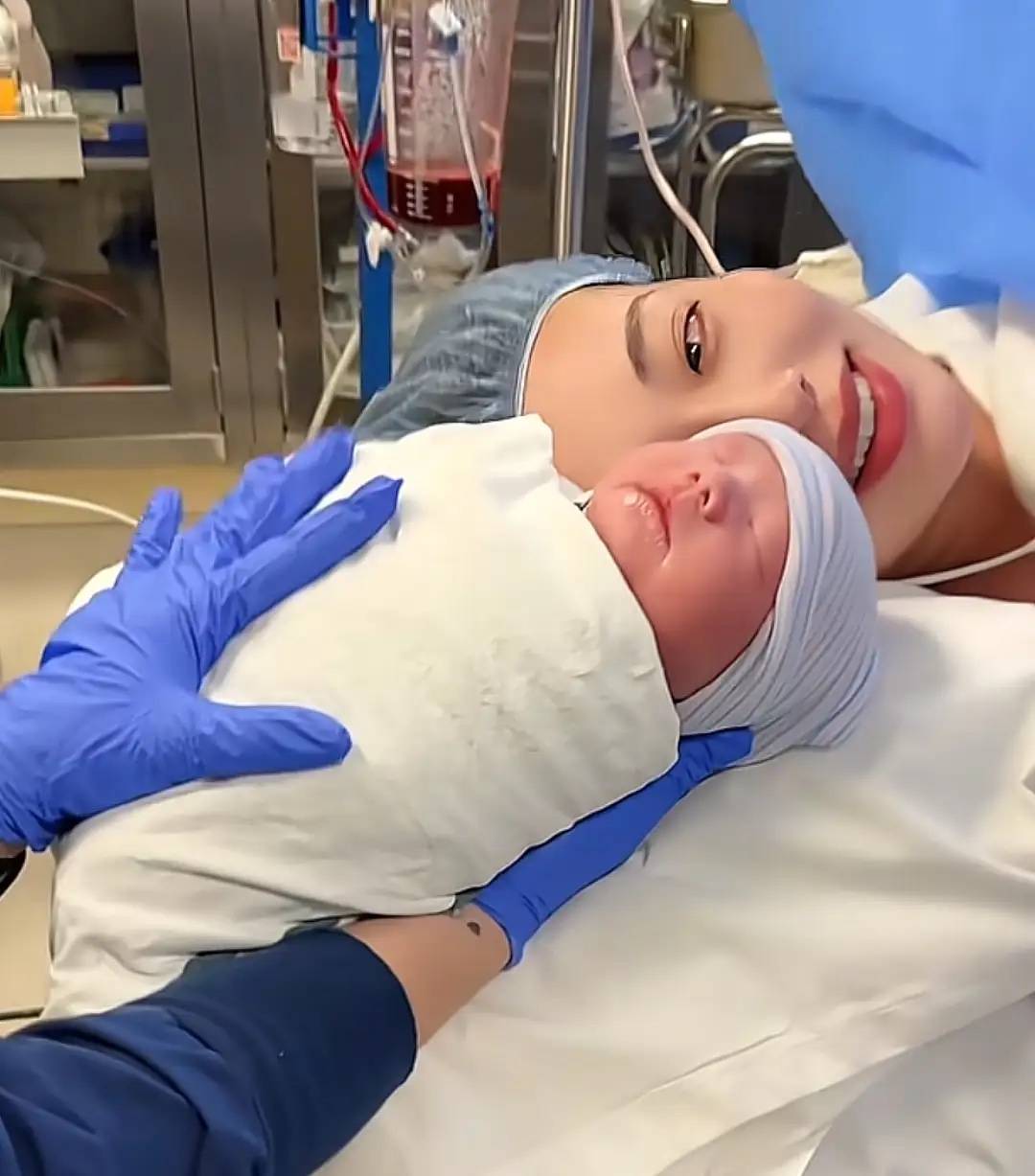 小女儿张思诺看着这个从自己肚子里出来的小宝宝,眼里含着泪花、脸上带着笑容,她升级当妈妈了,心里一定是幸福的吧。